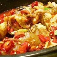 陽郎雞 出產(chǎn)于息烽陽郎壩的一道火鍋菜式,以當(dāng)?shù)禺a(chǎn)土雞和辣椒、大蒜為主要原料。雞肉嫩而糯,那種香噴噴的辣辣的滋味悠長而綿軟。 極辣。雞是現(xiàn)殺,雞血可生吃,但需要事先說明。貴陽街頭有許多打著“陽郎雞”招牌的店,價(jià)格在18元左右一斤,可以只要半只。 做法:把雞砍成均勻大小,勾芡,放鹽,拌勻腌制好擱一邊備用。油燒至六成熟,雞塊下鍋,爆炒至幾乎看不到血色,雞肉基本成熟時裝入高壓鍋,中火燜6~8分鐘后離火。再放油燒至七成熱,下糍粑辣椒,辣椒熟后,放入豆瓣醬,大蒜,炒至香氣四溢,燜好的雞肉倒入鍋內(nèi),一起拌勻,加姜塊,鹽,花椒,胡椒粉,醬油,待入味后起鍋裝盤。