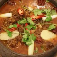 制法:1、初加工:選用20斤左右的當年土狗,先用木棒敲擊頭部使其暈死后再放血。用開水燙遍全身,煺凈毛。再用稻草點火燎至皮焦,最后用溫水泡軟刮洗干凈皮呈淡黃色,剖腹取內(nèi)臟,漂洗干凈;2、切配:取狗肉斬成塊每塊必須連皮帶骨。鮮山奈切節(jié),一部分狗肉香、姜切末,一部分姜切片,野蔥和蒜瓣分別切末,干辣椒用子母灰炮脆搓成面;3、烹制:取火鍋放入冷水,下入狗肉,用大火燒開打去泡沫,下入鮮山奈、姜片,改小火燉20-30分鐘,下入精鹽、胡椒、大蔥節(jié)、狗肉香,即可上桌邊煮邊吃;4、味碟的調(diào)制:取調(diào)味碗,放入辣椒面、花椒面、狗肉香末、姜蒜末、野蔥末、豆腐乳、精鹽和胡椒面,再舀鍋中帶油脂的湯汁調(diào)稀,隨狗肉上桌蘸食。