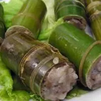 香竹飯又稱竹筒飯,即把糯米飯放在香竹筒里,用水浸泡15分鐘后,用火烘烤而成的。吃時,棰打竹筒使之變軟,竹筒內(nèi)壁的竹膜便貼在飯上,用力一剖兩半,香竹濃郁,飯軟而細膩。( 西雙版納) 像青筍一樣粗細的竹子做的。其做法是:先把香竹按兩個竹節(jié)砍下,在一端的竹節(jié)中挖一個孔,把洗過的糯米放入香竹中,再加入一些水,然后用竹葉塞住孔,放在火炭上烤。到竹子的水分被烘干后,竹筒就會自然爆裂,里面的香竹飯也就熟了。這時,你只要掰開竹片就能見到一層薄薄的白色香膜緊粘在糯米飯上,一根白色的糯米“香腸”展現(xiàn)在眼前,晶瑩柔軟的米粒彌漫著香味,讓人口生津液,胃口大開。