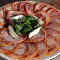 (4)將捆好的卷蹄放盆內(nèi)腌2晝夜,再放沸水鍋內(nèi)煮至熟透(不要煮得太爛),撈出晾涼,解掉捆繩,拆去縫線,空處用蘿卜絲和炒大米粉(大米炒熟磨碎)填塞,放時壇內(nèi),密封壇口,15-20日后即可食用。
