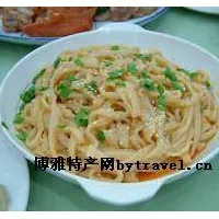 路井扯面,不是那種只扯一根頭的牛頭扯面,也不是那種用搟杖把面餅壓成爐齒狀,拉長(zhǎng)后再分開(kāi)的扯面,而是一扯數(shù)條、一鍋下幾斤的扯面,一次可盛十多碗。路井扯面和面與眾不同,即用即和,不需在盆里回性。關(guān)鍵是按季節(jié)不同掌握好水溫,把水面一氣揉成團(tuán),然后用搟杖推成一公分左右薄厚的面集,再以搟杖為界尺,用刀把面集劃成兩公分寬窄的面條。兩手一次可抓七八根,全身用力,反復(fù)回扯至薄厚均勻適中,下入滾水鍋中。講究火旺湯寬,隨煮隨湔,煮出的面條筋而不粘,滑溜可口。裝碗后除調(diào)上鹽醋外,還要加上物制的豆腐蔥花臊子,再加油潑辣子,香氣撲鼻,令人垂涎。