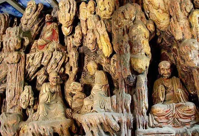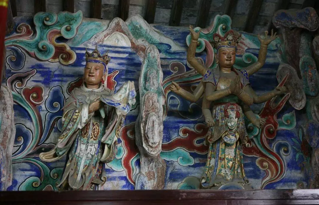 大殿內(nèi)原保存有十八尊羅漢塑像,現(xiàn)僅存九尊。塑像附于塑壁之上,有云水山崖相間的塑壁作背村。有達(dá)摩祖師像、袒腹羅漢、降龍羅漢、講經(jīng)羅漢、聽(tīng)經(jīng)羅漢等。