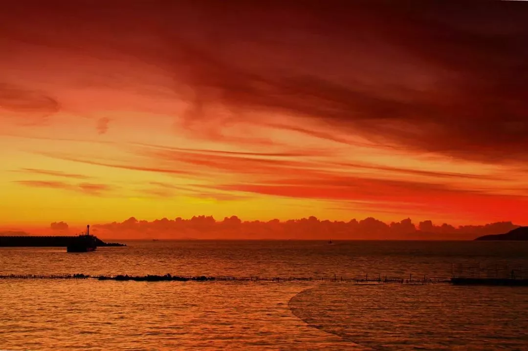每到暮色黃昏,黃沙村的海邊總是極盡絢爛,那里是泗礁落日最美的地方。從起初無人無物,唯天海見證,到后來漁人定居,夕陽紅海時也就多了帆影點綴。這片紅耀傾海的壯美,山海沉寂,夕色靈溟,年年又月月!