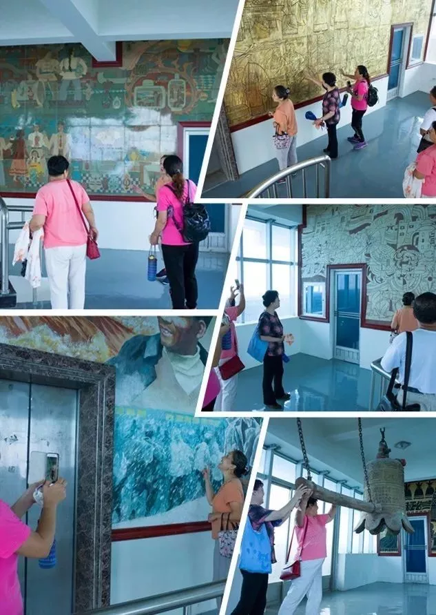 便在壁畫和雕塑前合影留念