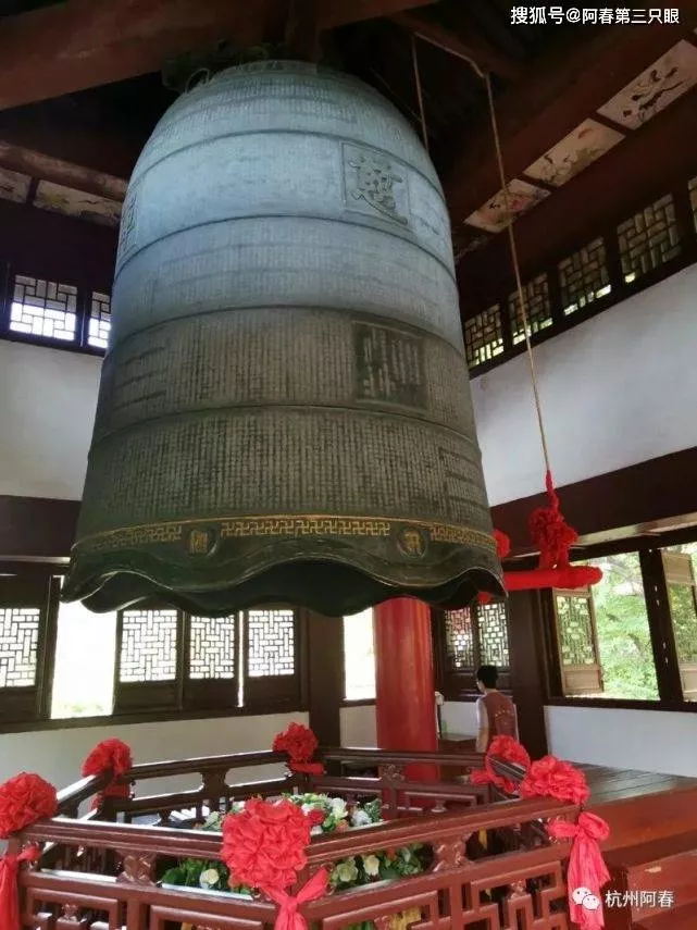 這口銅鐘懸掛在凈慈寺重建的二層三檐的鐘樓內(nèi),高3.6米,直徑2.3米,重一萬公斤。造型古樸,外面鑄有《大乘妙法蓮華經(jīng)》,6.8萬余字,鑄造精致,每敲一下,余音達(dá)2分鐘之久,余音裊裊,十分渾重動聽。