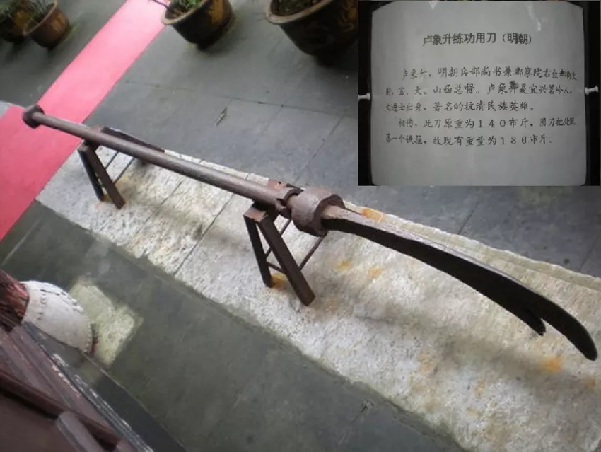盧象升練功刀。盧象升是明末抗后金名將,天生神力,善用大刀,有萬夫不當(dāng)之勇,人送外號“盧閻王”。盧象升用的作戰(zhàn)大刀多少斤無考,他的一把練功大刀陳列在江蘇無錫宜興市宜城街道的“盧忠肅公祠”內(nèi)。這把刀原重140斤,因脫落一鐵環(huán),現(xiàn)重136斤。盧象升用這么重的刀練功,可見他力大過人。在巨鹿賈莊戰(zhàn)斗中,明軍被數(shù)萬清軍包圍。盧象升指揮兵將打完最后一炮,舞動大刀沖入敵陣,斬殺數(shù)十清兵清將,他身中四箭三刀,仍然大聲疾呼:“關(guān)羽斷頭,馬援裹革,在此時矣!”最后,盧象升鮮血流盡,力竭戰(zhàn)死。
