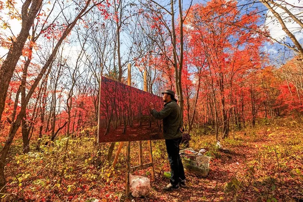 繼續(xù)北上,三個半小時便來到同位于赤峰市的黃崗梁國家森林公園。進入公園的藝術按鍵,秋色排山倒海涌入眼簾,讓人忍不住拿出手機,隨手一拍即大片。
