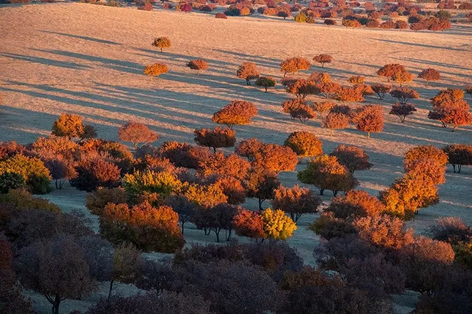 沿京藏高速繼續(xù)向東,進入赤峰市,秋景美醉之處當屬烏蘭布統(tǒng)草原,低矮盤曲的小山丘層林盡染,美林谷山間的紅葉沙沙作響。