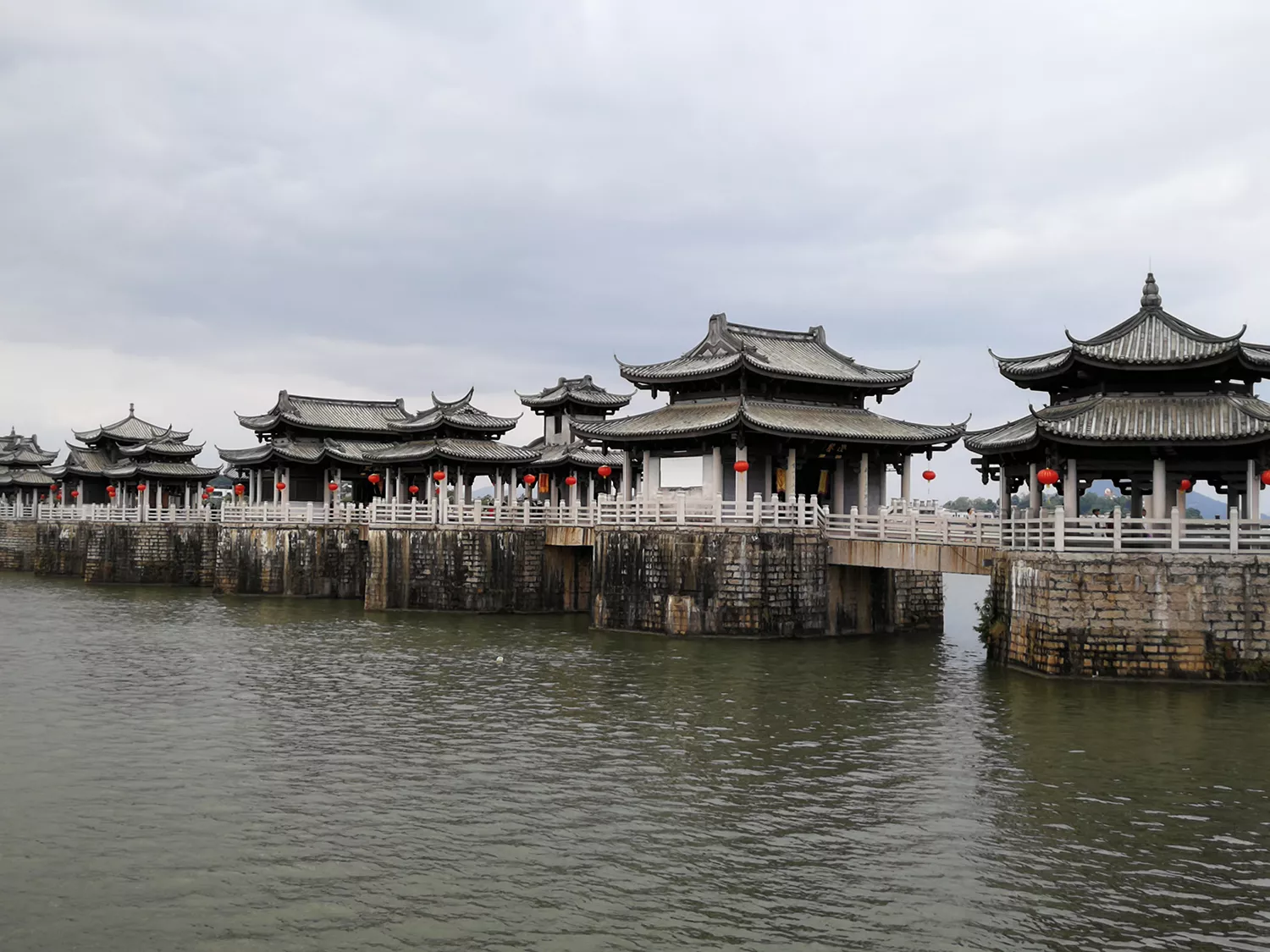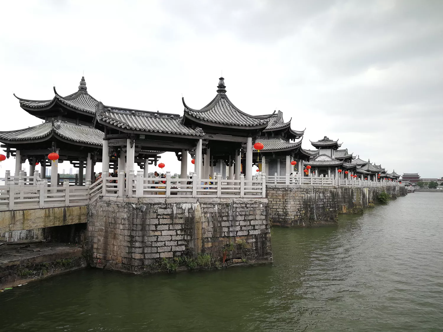 后歷代均有修葺,明宣德十年(1435年),由潮州知府王源主持對橋進行規(guī)??涨暗闹匦?,全面加固23個橋墩,墩上加梁,木石間用,梁上鋪厚板,板上再鋪磚,并用灰勾縫以防火。為使行人免遭日曬雨淋,還在橋上建起126間亭屋,亭屋間建造了12座樓閣(也稱“樓臺”)。江心急流處,仍用24艘船只連接為浮橋,浮橋用3根鐵索固定,每根鐵索重4000斤,橋修好后,更名為“廣濟橋”,寓意為“廣濟百粵之民”。明嘉靖九年(1530年),州守丘其仁減去浮橋用船六只,“十八梭船廿四洲”之格局從此形成,自初建以來,共歷時359年。