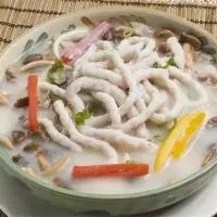 魚(yú)面,是廣東陽(yáng)江閘坡漁港的一種名菜。當(dāng)?shù)佤~(yú)面的制作工藝非常精細(xì),主要以面粉和鮮魚(yú)肉為原料,制作時(shí)取鮮魚(yú)肉剁成泥漿狀,然后加一定比例的淀粉和食鹽揉搓成面。之后將面分成團(tuán),用搟面杖將面團(tuán)搟成蒲扇大小的薄面餅。最后卷成卷,放蒸籠猛火蒸熟,出蘢后攤開(kāi),于日光下曬干即可。一般吃法是炒或者煮湯,無(wú)論哪一吃法,它都具有軟,滑,甜,爽等特點(diǎn),一直是當(dāng)?shù)孛癖娮類(lèi)?ài)的一種美味面食。
