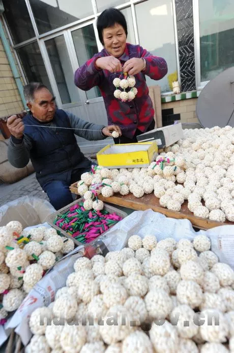 歡喜團(tuán)子是山東淄博市桓臺(tái)縣及周邊地區(qū)的一種漢族民俗小吃,春節(jié)期間,桓臺(tái)及周邊地區(qū)的民眾家家都會(huì)制作為年夜飯的一個(gè)品種,在大型廟會(huì)(如梧臺(tái)廟會(huì))和年關(guān)大集上也能到處看到這小吃,美觀美味又有美好寓意。歡喜團(tuán)子分為大團(tuán)、中團(tuán)和小團(tuán),大團(tuán)如桔子,中團(tuán)似核桃,小團(tuán)像山楂。歡喜團(tuán)子制作方法十分簡(jiǎn)單:將糯米蒸熟,涼后弄散,炒至膨松,蘸取糖稀,制成大小不同的球狀。按照單串、雙穗、小掛角、大掛角等形式穿掛起來(lái)。