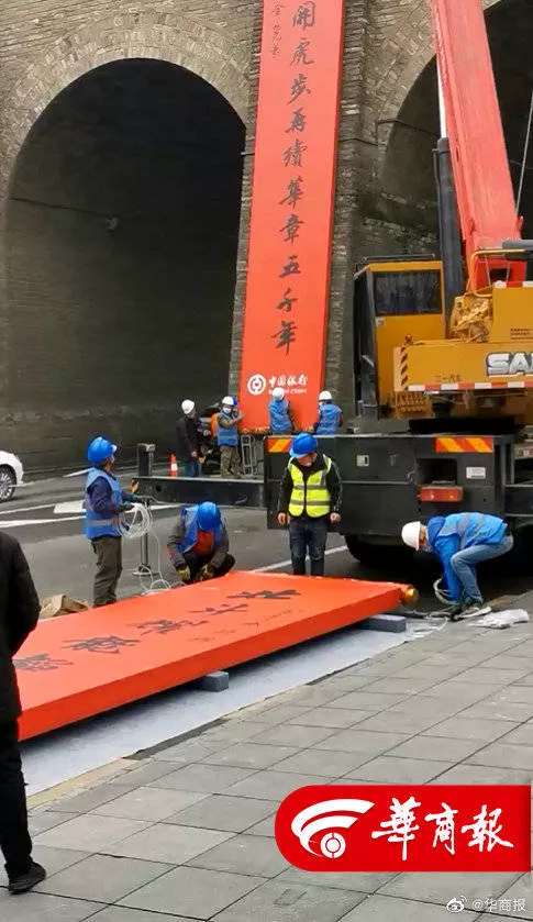 據(jù)了解,掛在南門城墻的春聯(lián)先是經(jīng)過面向社會(huì)征集,春聯(lián)確定后在由書法家下來,然后制成巨幅春聯(lián)掛在南門。往年春聯(lián)一般都會(huì)在(農(nóng)歷二十三)小年之前掛好,由于今年疫情防控,才推遲了幾天。
