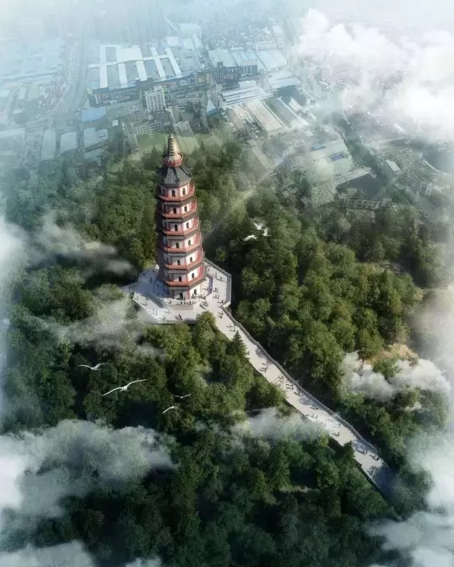 根據(jù)現(xiàn)有的歷史典籍,在多位古建筑專家的多方論證后,決定將寶峰塔在原塔基上進(jìn)行復(fù)建。從寶峰塔下連綿的石階可以直達(dá)山腳的大霧崗公園。