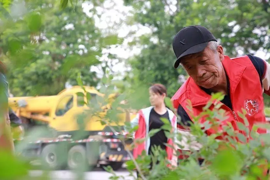 在利民街村東北角,志愿服務(wù)隊(duì)的隊(duì)旗迎風(fēng)招展。隊(duì)員們拿著鐮刀、鐵鍬等工具,分散在這片雜草叢生的區(qū)域里,割草的割草,裝運(yùn)的裝運(yùn),忙得熱火朝天