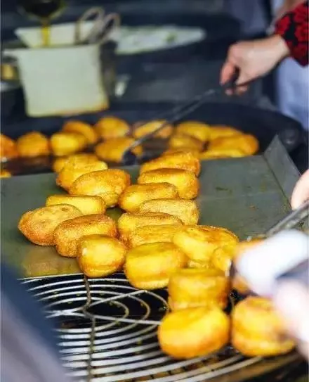 走在街頭巷尾,一不小心就能看到煤球爐子上架口小黑鍋,系著圍裙的大爺大媽正歡快地忙活著。大爺用水將糯米粉揉成團(tuán),然后裹上紅豆沙或肉末,再放到沸油鍋里氽,一陣“滋啦啦”后,白面皮兒慢慢變成了金黃色。剛炸好的油墩色澤金黃,形似三節(jié)腰的紙燈籠,入口外殼香脆,內(nèi)層軟糯,里餡兒甜咸入味,味道極美。
