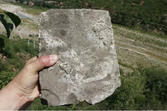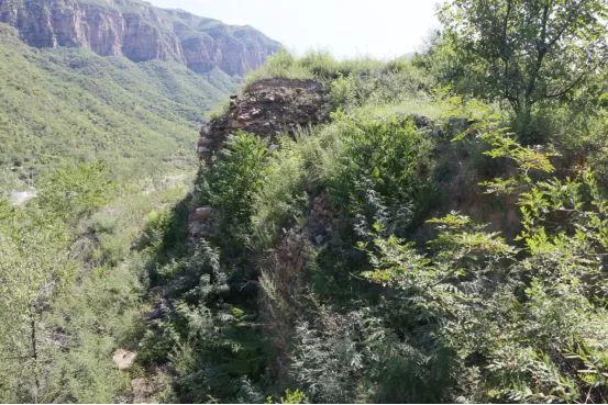 從敵樓一側(cè)延伸出去的長(zhǎng)城墻體如今遺跡尚存,蜿蜒的形態(tài)好似一條長(zhǎng)龍,盤(pán)旋在山脊上。沿著城墻仔細(xì)查看,記者發(fā)現(xiàn)墻體采用了兩種不同建筑材料:靠近河岸的200米用青磚壘砌,往山上1600多米則由本地太行山上的片麻巖條石鋪成。