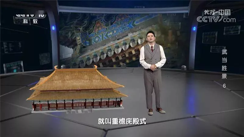 主持人 勝春:修復(fù)工程的建筑專家剛才說了一個(gè)詞,單檐硬山靠。這個(gè)詞是古建筑領(lǐng)域的一個(gè)專業(yè)名詞,用來描述古屋房頂?shù)男沃啤T谥袊墓沤ㄖ?dāng)中,不同規(guī)格不同等級(jí)的房屋,它的房頂形制是不一樣的。咱們來簡(jiǎn)單介紹幾種。這是故宮太和殿,它的屋頂形制,叫廡殿式,同時(shí),它又有兩層屋檐,所以這種屋頂?shù)娜Q就叫重檐廡殿式,這是中國古建筑最高規(guī)格的形制,只有皇家,和受皇封的宮觀,才能用這種屋頂,比如武當(dāng)山金殿,也是這種形制。