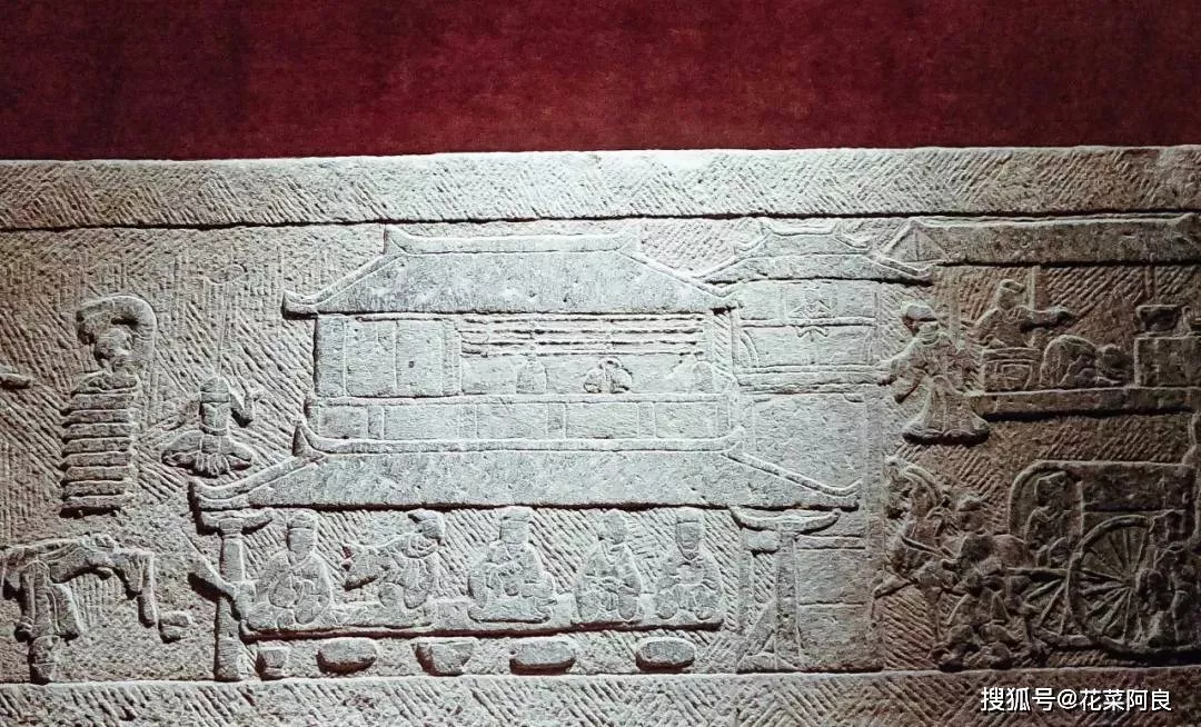 石棺上的圖案是一副主人宴客圖。石棺左側(cè)是宴飲舞樂(lè)雜技圖,雜耍人正表演著頂技、踏鼓等節(jié)目。正中是墓主人請(qǐng)來(lái)的五名賓客,跪坐于席,大飲大宴,正在欣賞左邊的雜技表演。在賓客的右方,有一個(gè)人正憑欄遠(yuǎn)眺下方正坐著馬車徐徐而來(lái)的賓客。