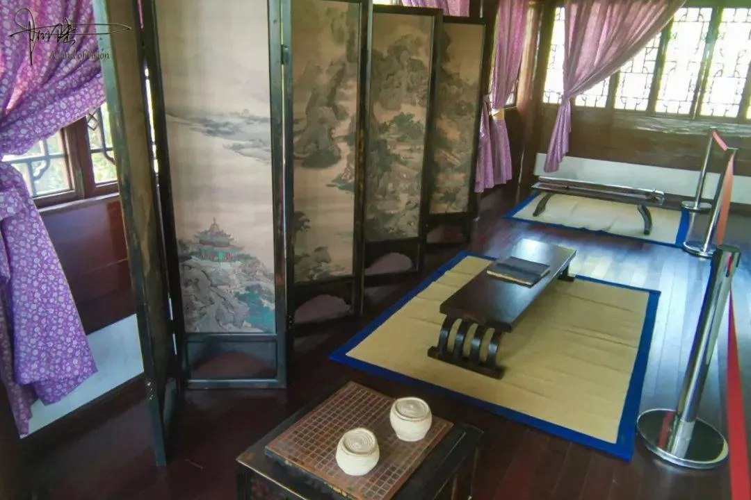 另一側(cè)的書房中規(guī)中矩,書桌上的文房四寶及琴案屏風(fēng),一看就是大戶人家的作派。
