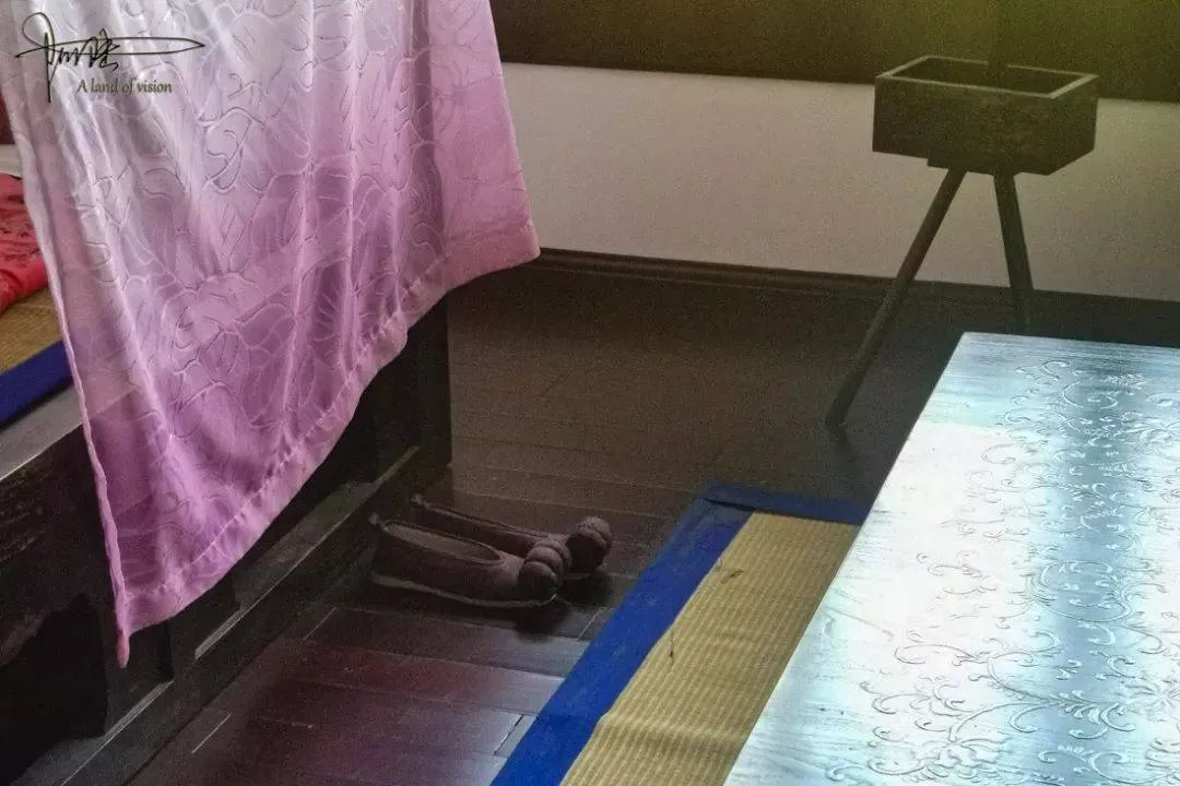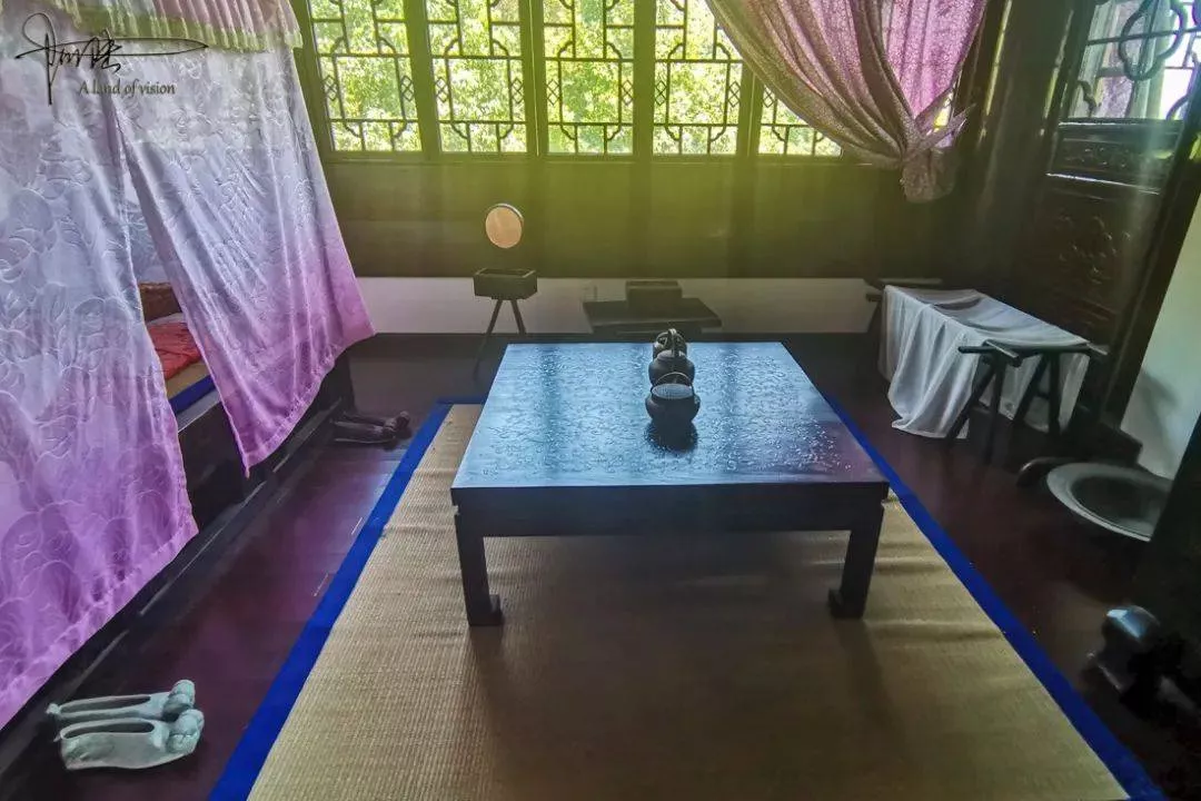 在主臥,紗帳,紗簾,茶幾香案,銅鏡及各種我也叫不名字的擺件一應(yīng)俱全。不知道是不是有人點(diǎn)著檀香,配上淡淡的古典音樂,極有氛圍。